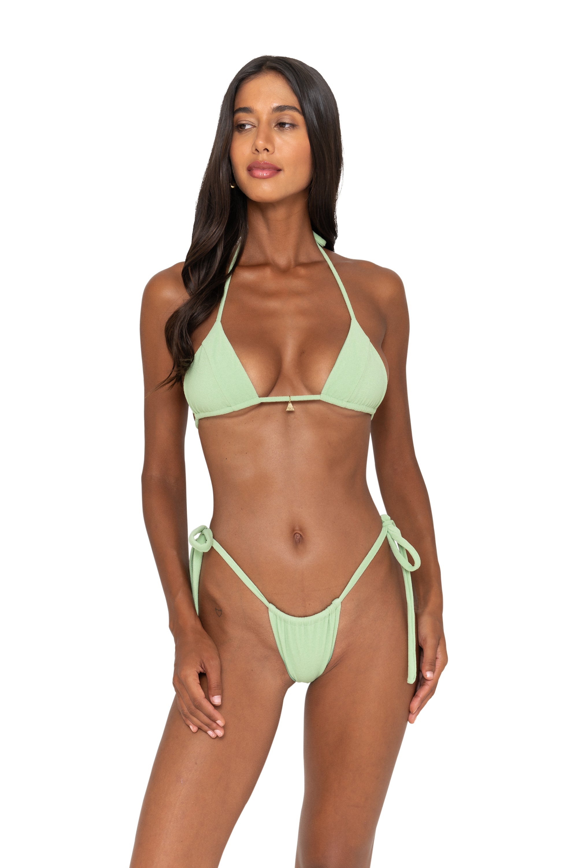 A seamless triangle top with refined paneling and a custom gold FAE charm. Designed for versatile styling and crafted from the finest sustainable Nylon.
