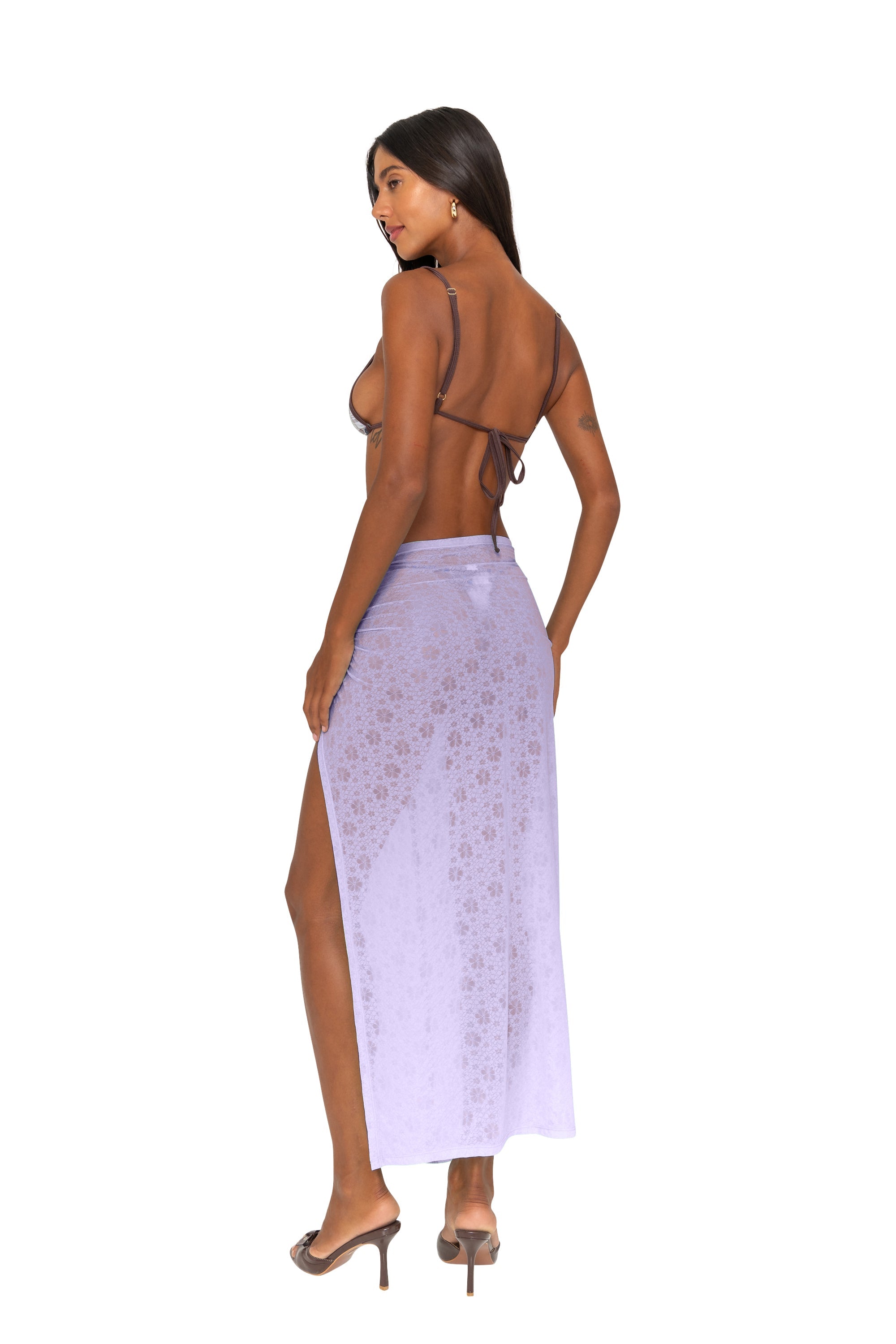 Maxi skirt with a high side split and knotted detail at the hip. Lightweight and effortless for resort wear. Crafted from a delicate floral-embossed mesh fabric.